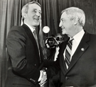 • Peter Lougheed, Premier of Alberta (right), greets Brian Mulroney, Prime Minister of Canada (left), 1984. Source: CP Photo/Pat Price, 673836