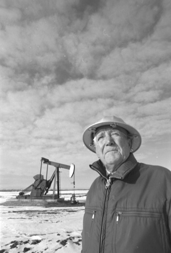 A wellsite geologist stands in front of the Pembina No. 1 oil well. A joint venture of two oil companies, this well successfully strikes oil about 100 km (62 mi.) southwest of Edmonton. The oil at Pembina is accessed by a developing technology called sandstone fracturing or “fracking.” This technology makes it possible to extract previously inaccessible oil reserves and becomes more widely used throughout Alberta in the following decades.