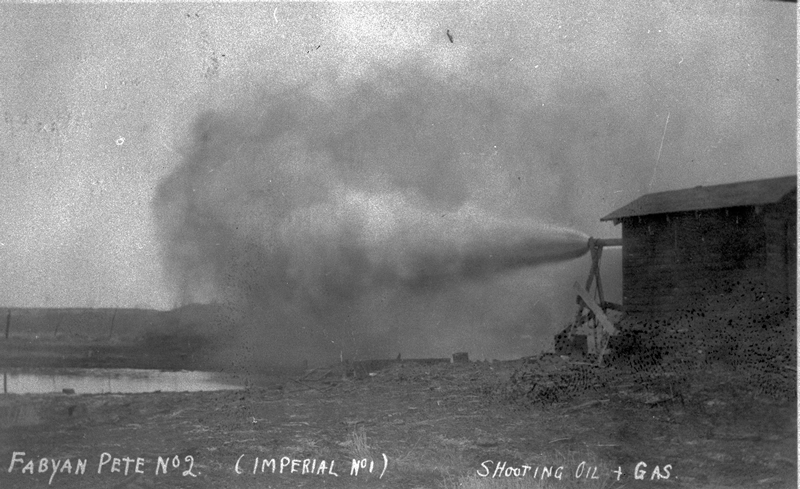 • Oil well Royalties No. 1 as a gusher after striking oil on June 16, 1936. Source: Glenbow Archives, NA-2335-2