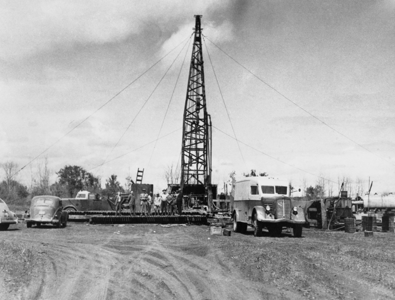 A wellsite geologist stands in front of the Pembina No. 1 oil well. A joint venture of two oil companies, this well successfully strikes oil about 100 km (62 mi.) southwest of Edmonton. The oil at Pembina is accessed by a developing technology called sandstone fracturing or “fracking.” This technology makes it possible to extract previously inaccessible oil reserves and becomes more widely used throughout Alberta in the following decades.