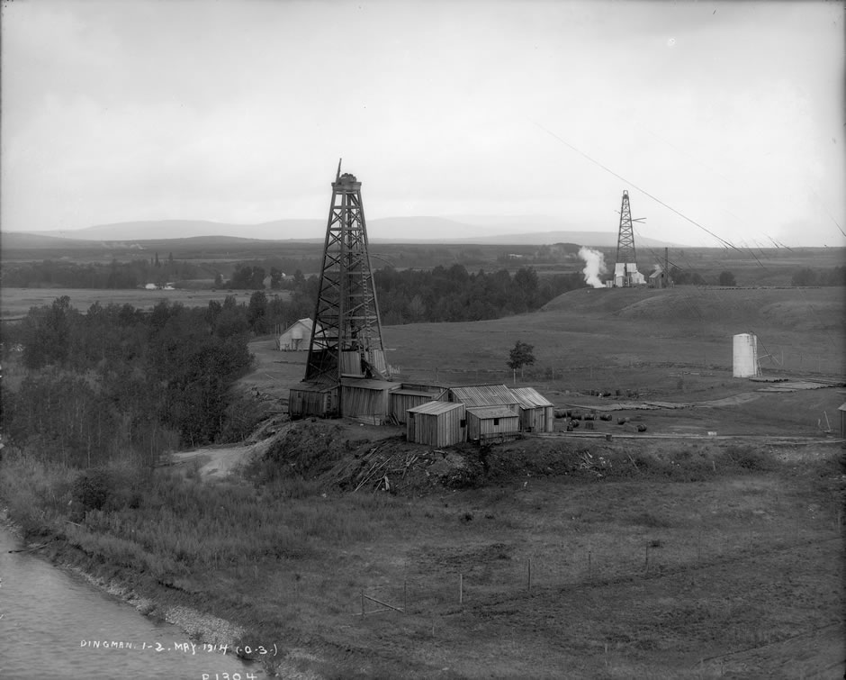• Calgary Petroleum Products discovers wet gas at the Dingman No. 1 well on the Sheep River in Turner Valley on May 14, 1914. Calgary Petroleum Products begins installing equipment to process the raw petroleum product. <br />Source: Glenbow Archives, NA-2335-4.